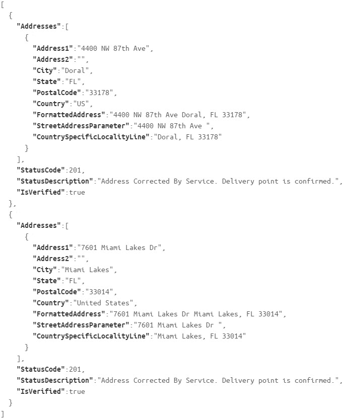 The address validation module is used for validating any number of domestic or international physical addresses. There are currently two resources available for use: one for validating a single address, and one for validating a batch of addresses. Each resource accepts a JSON object as a parameter and must be accessed using HTTP POST.